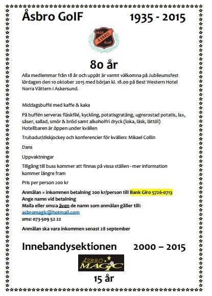 Åsbro GoIF 1935-2015 80 år Alla medlemmar från 18 år och uppåt är varmt välkomna på Jubileumsfest lördagen den 10 oktober 2015 med början kl. 18.00 på Best Western Hotel Norra Vättern i Askersund. Middagsbuffé med kaffe & kaka På buffén serveras fläskfilé, kyckling, potatisgratäng, ugnsrostad potatis, lax, såser, sallad, smör & bröd samt alkoholfri dryck (loka, läsk, lättöl) Hotellbaren är öppen under kvällen Trubadur/diskjockey och konferencier för kvällen: Mikael Collin Dans Uppvaktningar Tillgång till buss kommer att finnas på vissa ställen - mer information kommer längre fram Pris per person 200 kr Anmälan = inkommen betalning 200 kr/person till Bank Giro 5726-0713 Ange namn vid betalning Maila eller sms:a även de namn som anmälan gäller till: asbromagic@hotmail.com sms: 073-509 52 22 Anmälan ska vara inkommen senast 28 september Innebandysektionen 2000 – 2015 år