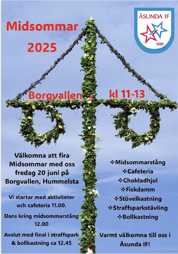 Visst vill vi få till ett midsommarfirande i år igen? Det är en härlig tradition som lockar många människor och ger föreningen ett bra klirr i kassan. Vi är ett antal ledare och styrelsemedlemmar som ställer upp på olika stationer och bemanning i kafeterian, men vi behöver bli några fler. Kan ni tänka er att bemanna en station 30 min under dagen? Hör av er till Elin eller Sanna. (Elinivela@gmail.com eller millberg_8@hotmail.com)
