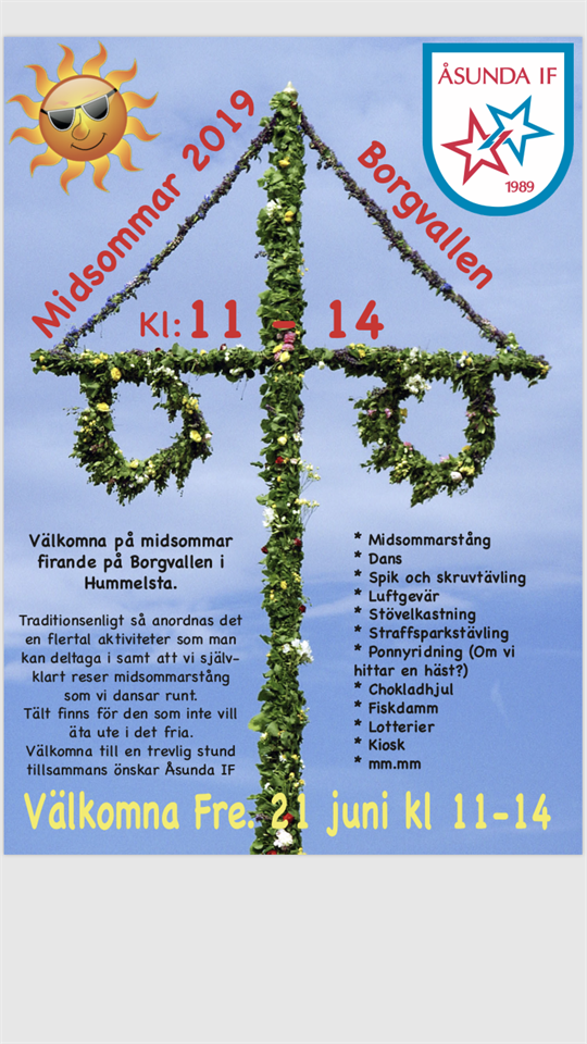 Med förhoppning att få fler att hjälpa till att klä Midsommarstången så testar vi i år att ses på Borgvallen redan på onsdag kväll kl 18.00. Går även bra att lämna in priser, som vi tidigare bett om hjälp med, denna kväll. Så ta med ris och verktyg som kan behövas så hjälps vi åt att klä en grann stång även i år. Blommor till kransarna är nog med fördel bättre att sätta i på Midsommaraftons morgon när vi förbereder stationerna. Tack för er hjälp! PS. Om du inte kan deltaga på Midsommarafton så är du välkommen att stödja föreningen denna kväll med din hjälp Åsunda IF Förening 16 jun 2019 0kommentarer