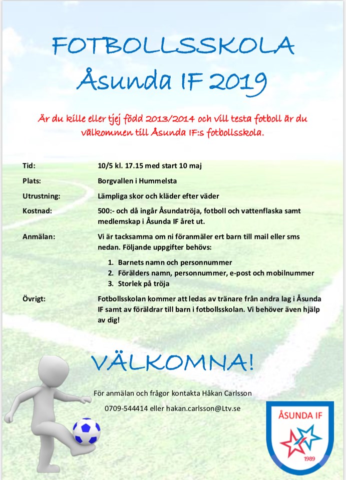Nu är det snart dags för årets fotbollsskola. 10 maj kl 17.15 drar vi igång på Borgvallen. Kostnad: 500kr för fotbollsskola och medlemskap året ut, tröja, fotboll och vattenflaska. Gärna föranmälan på mail eller sms till Håkan Carlsson, hakan.carlsson@ltv.se eller 070-954 44 14. Se bifogad bild. Varmt välkommen!