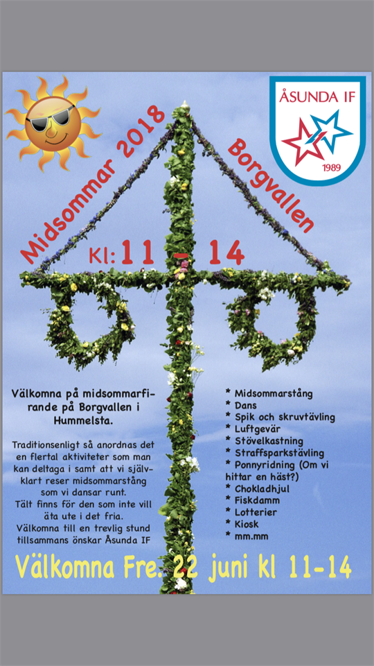 Varmt välkomna till Borgvallen på Midsommar! Vi bjuder på traditionsenligt firande med lekar, dans och cafeteria. Hoppas vi ses! Åsunda IF Förening 13 jun 2018 5kommentarer
