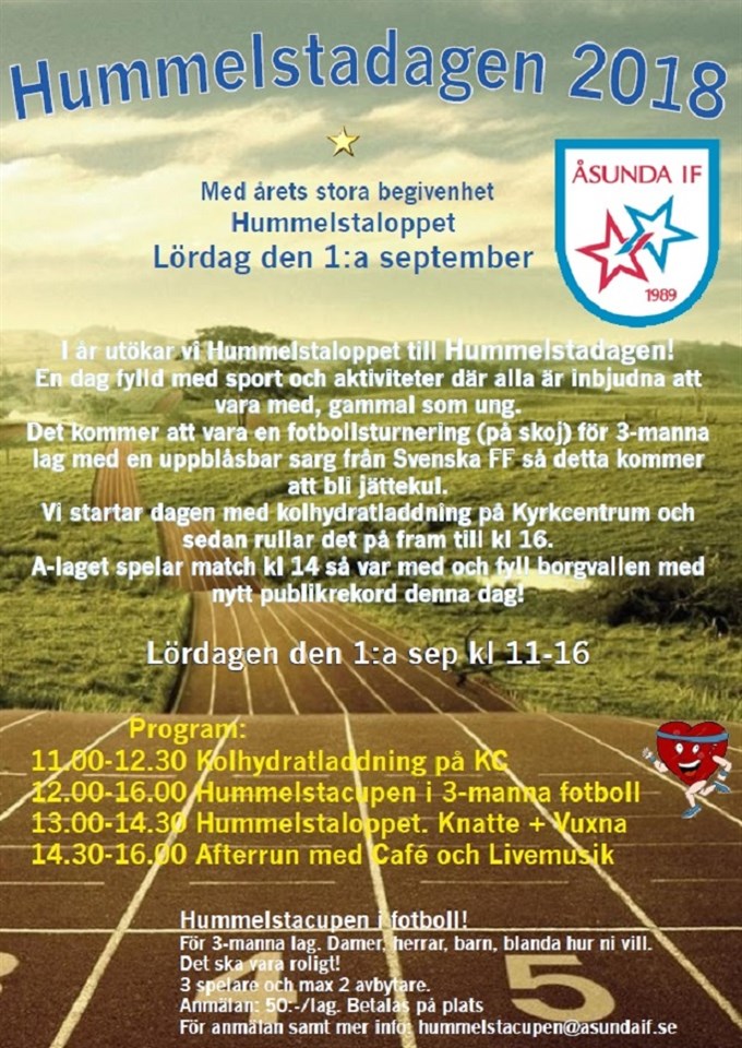 Hej I år har vi utökat Hummelstaloppet till en Hummelstadag. Vi hoppas på många aktiva på loppet och Hummelstacupen och även hejaklacken till A lags match! Ses den den första september Janne, Jonas, Per, Stefan och Thorsten Åsunda IF Förening 19 jul 2018 2kommentarer