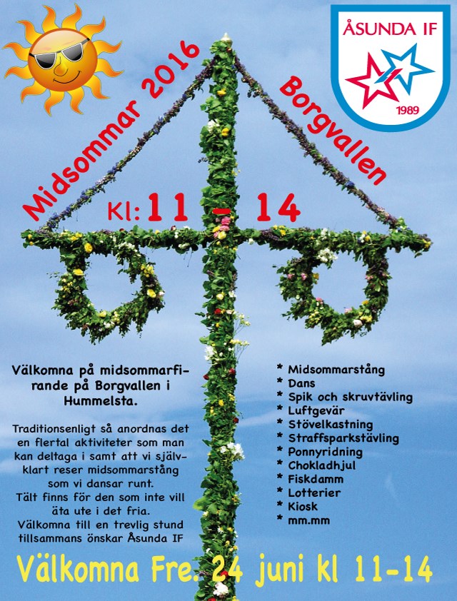 Hej! Som ni alla vet så är det snart midsommar. Vi firar som vanligt på Borgvallen och här är infon som går ut till alla i bygden. Alla lag har ju fått arbetsuppgifter som ska lösas under dagen så kolla vilken uppgift ert lag har och anmäl er medverkan till er lagledare.Här behöver vi er föräldrar och ju fler vi är desto roligare och lättare blir det :-). Herr: Tält + Stövelkastning Dam: Tält + Luftgevär F-02: Lotterier P-03: Spik + skruvdragning PF-05: Cafeteria F-07: Fiskdamm P-07/08: Chokladhjul PF-09/10: Tennisbollar Varmt välkomna! Åsunda IF Förening 30 maj 2016 5kommentarer