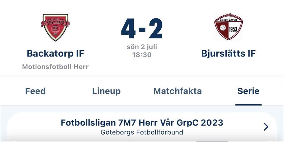 Sista seriematchen så jobbade vi på bra! Vi låg rätt i våra positioner, slog inte bort några onödiga bollar och var kompakta i försvaret. Vi släppte in två onödiga mål dock, genom egna misstag men överlag så gjorde vi det mesta rätt och stod som segrare efter slutsignalen. Vi kör igång första veckan i augusti med träningar, vi skickar ut kallelser när vi har spikat datum för både träningar och höstens seriespel. Vi siktar på att starta serien ungefär sista veckan i augusti. Nu tar vi en välförtjänt sommaruppehåll så ha en fantastisk sommar så ses vi i augusti igen. Heja Backatorp!!! Motionsfotboll herrar 2 jul 2023 1kommentar