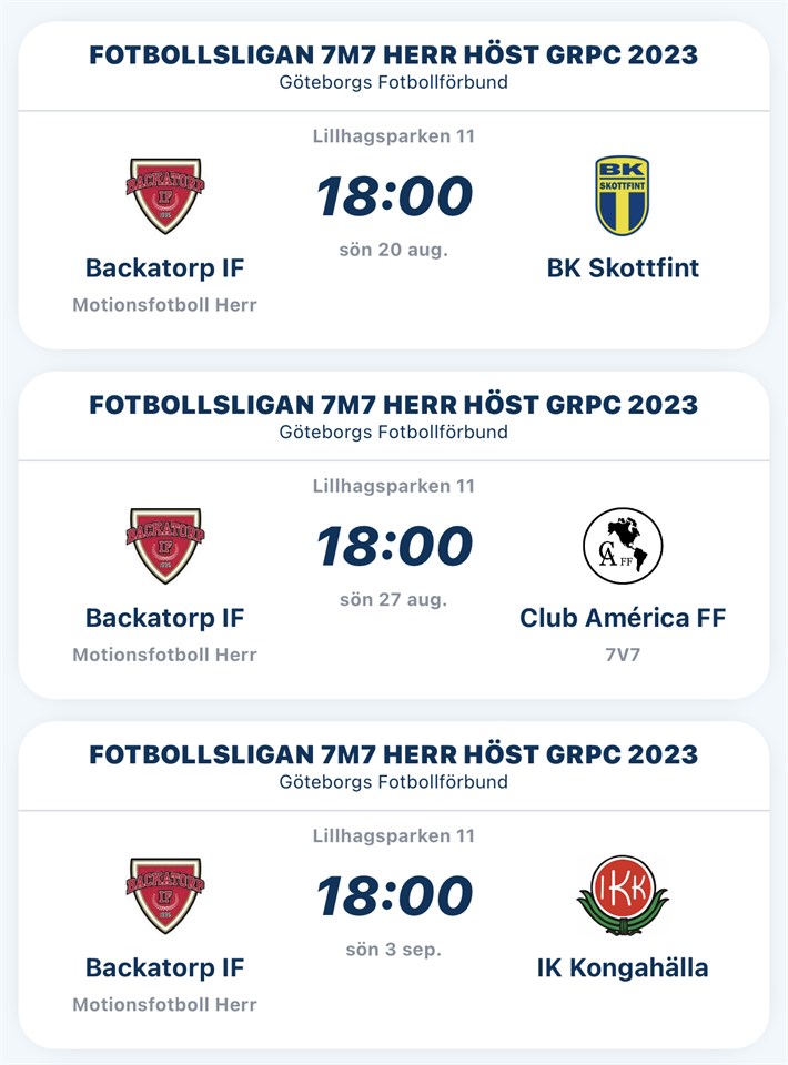 Hej vänner, Hoppas att ni har haft en fin ledighet och är sugna på fotboll. Det är dags att kicka igång den nya säsongen med vår första träning redan nu på måndag och sedan match på söndag hemma mot BK skottfint(kallelse kommer!). Ha det fint nu så syns vi på måndag. Heja Backatorp! Motionsfotboll herrar 11 aug 2023 2kommentarer