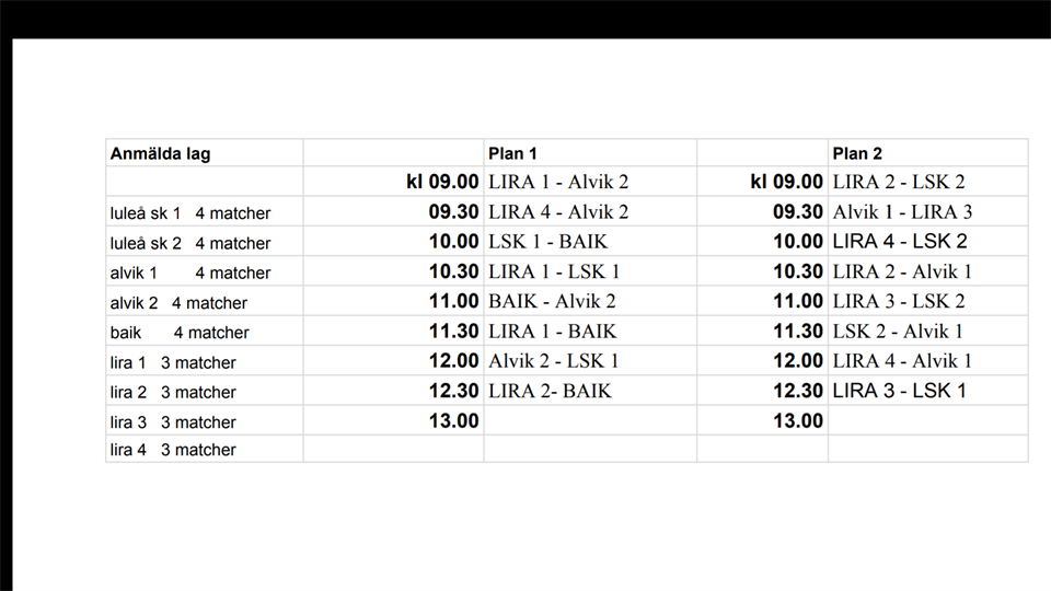 Hej. Nu har vi fått spelschema och lite info kring nästa helgs sammandrag. Lördag 25/8 på Björkskatans idrottsplats kl 9-13. Det är 9 anmälda lag från Luleå SK, BAIK, Lira BK och Alvik. Vi spelar 3 mot 3 matcher enligt de Nationella spelformerna. Lira BK kommer att stå för domare. Fika och varmkorv finns att köpa vid sidan av planen. Betalning via Swish. /Ledarna F-11 19 aug 2018 3kommentarer