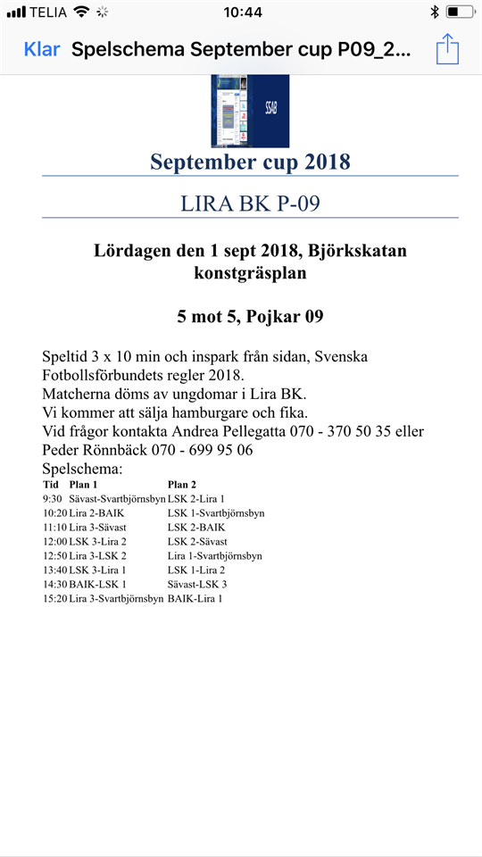 Hej! Här kommer info om cupen 1/9. Som vanligt samlas vi 20 min före matchstart. P-09 24 aug 2018 0kommentarer