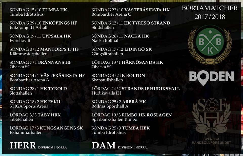 Herrarna åker på söndag ned till Stockholm för säsongens tredje match. Denna gång är det Tumba HK som står för motståndet. Tumba HK är Allsvenska IFK Tumbas utvecklingslag och de gör sin andra säsong i norrettan. Förra säsongen slutade laget på en 5:e plats efter att länge varit uppe och tampats om en av topplaceringarna. Årets säsong har dock Tumba inlett med 2 raka förluster. Först mot Brännan i premiären och sedan blev de rejält överkörda med 44-25 av Västerås/Irsta i söndags. Laget är mycket ungt och i den senaste matchen mot V/I var samtliga spelare födda mellan 98-00. Tumba är dock inte på något sätt ofarliga, vilket de visade i premiären mot Brännan. En match som de länge hade grepp om men tappade i slutändan. Eftersom det rör sig om ett så pass ungt lag så har vi inte någon detaljkunskap runt enskilda spelare, men det rör sig med all säkerhet om ett välutbildat lag. Stämningen i den egna truppen är god sedan söndagens övertygande seger mot Kungsängen och veckans träningar har flutit på enligt rutin. En förändring görs i laget mot senast och det är att Mattias Karlsson är åter efter sjukdom och ersätter Mattias Lindström. Matchen spelas i Tumba Idrottshus på söndag 13:30 och förhoppningsvis kommer den att visas via BBK live. Herr 14 okt 2017 0kommentarer