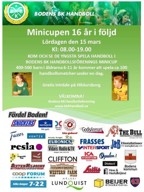2013 års MiniCup är avlsutad! Drygt 500 spelare har spelat 100 matcher under denna minilirardag! Idrott när det är som bäst....glada barn oavsett resultat där stor del av nöjet är allsköns aktiviteter mellan matcherna! Från arrangörsföreningen vill vi rikta ett stort tack till alla deltagande lag, ledare,publik som alla varit med och bidragit till dagens "handbollsfest" på Hildursborg och Björknäshallen! Ett sådant här arrangemang vore omöjligt att genomföra utan alla funtionärer, domare, föräldrar: Stort tack till A-ungdom,herrar,damer, föräldrar, styrelse mfl! De äldsta ålderklasserna har spelat om en Pokal! Slutsegrare: FL 01 - Strömnäs GIF P 01 - Norrfjärdens IF FL 02 - Bodens BK HF P 02 - Kalix HK Grattis! MiniCup 21 mar 2013 0kommentarer