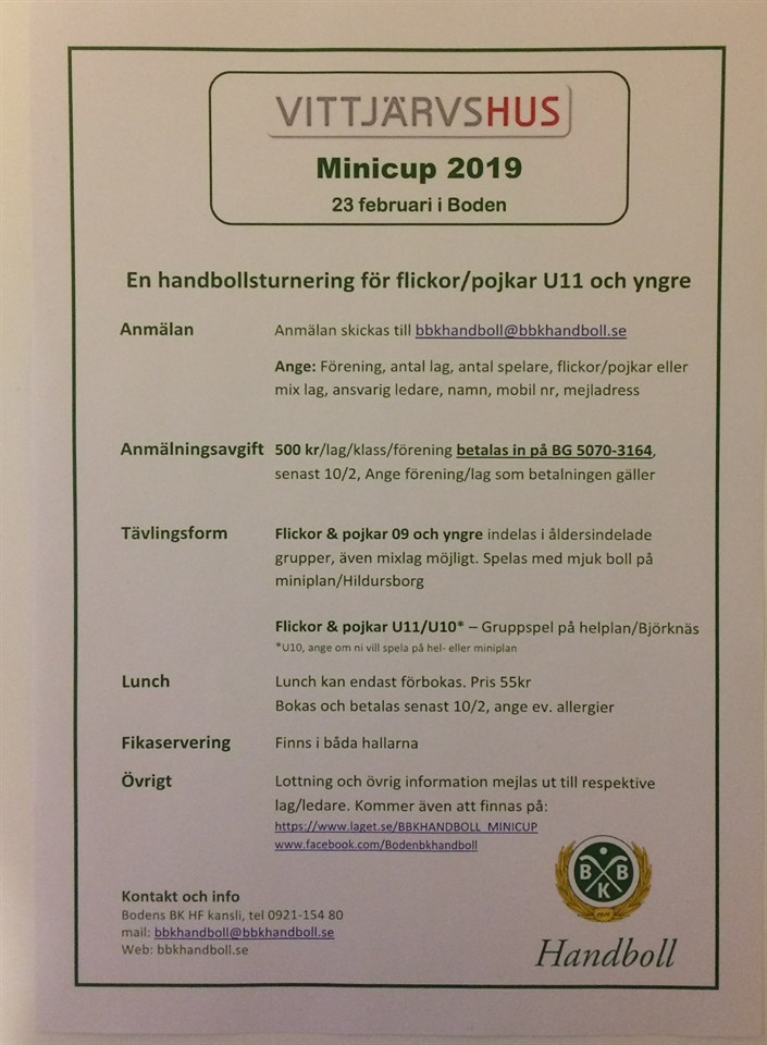Bodens BK hälsar samtliga spelare, ledare och övriga Varmt Välkomna till Bodens MINICUP Spelplatser: kommer att vara Hildursborg och Björknäshallen. Hildursborg- Viktigt att följa information om tilldelade omklädningsrum. Björknäshallen-Omklädningsrum på övre plan OBS! För samtliga spelhallar gäller:lämna inga värdesaker i omklädningsrummen! Anmäl ankomst innan första match i respektive hall! Vid incheckningen säkerställer vi att ni är på plats och att de eventuella ändringarna kommit er tillhanda. Lagen hämtar också ut: Matkuponger, medaljer och övrig information. Måltider: Endast förbeställda, serveras i Hildursborg och BBK:s kansli. Information: Information publiceras MiniCupens webbsida: http://www.laget.se/BBK_HANDBOLL_MINICUP/start.html Övrigt: Funktionärer och övrig personal: GULA västar Försäljning: Det kommer att finnas försäljning i Hildursborg och Björknäshallen. Betalning med kontanter eller swisch. MiniCup 22 feb 2018 1kommentar