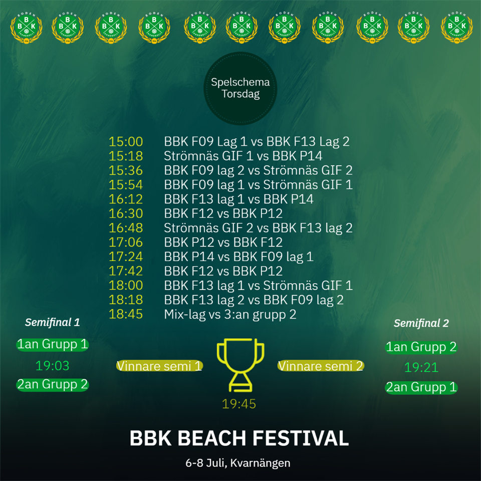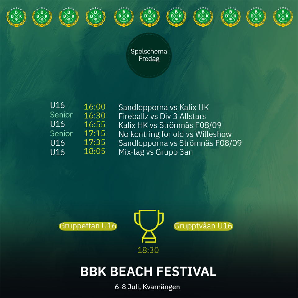 Nu är det dags för den årliga beachhandbollsturneringen! Under fredagen är det matcher för U16 & Seniorer och spelschema hittar ni på bilden. BBK Handboll 5 jul 2023 0kommentarer