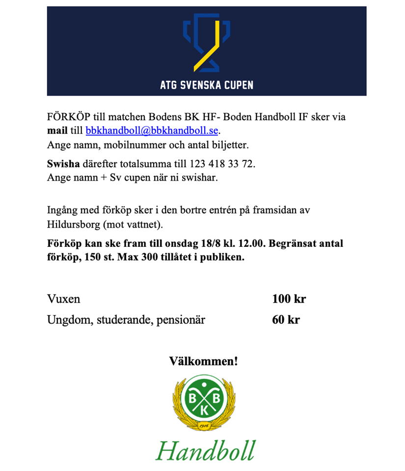 BBK:s seniorlag spelar 4 st. hemmamatcher i Svenska Cupen och våra ungdomslag erbjuds att se tre av matcherna kostnadsfritt i mån av plats. Ni behöver anmäla in vilket lag det gäller, vilken match ni önskar se, samt antal till Anna-Karin Berg, mail: akb22222@gmail.com eller sms 076-7819070 senast dagen innan respektive match. Laget går in i samlad trupp precis innan matchstart i mån av plats. Max 300 är tillåtet i publiken. Matcherna: 14/8 kl. 14.30 BBK- IF Hallby HK (herr) 28/8 kl. 15.00 BBK- H65 Höör (dam) 29/8 kl. 16.00 BBK- Eskilstuna GUIF (herr) På onsdag 18/8 kl. 19.00 kan man även se BBK- Boden Handboll (dam) mot entréavgift och där gäller först till kvarn. Välkomna!
