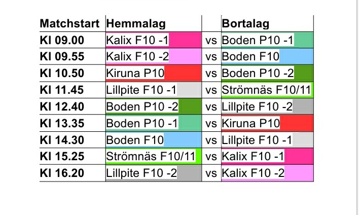Nu har spelschemat och riktlinjerna för årets första sammandrag kommit från arrangörerna. Avresa 07.15 Boden Arena Hemresa 15.30 Kalix Sportcity Vi samåker buss tillsammans med BBK F10 men sitter samlat lagvis. 1. Matcherna spelar på stor plan, 2x20min, med 5 utespelare och 1 målvakt. 2. Laget tilldelas eget omklädningsrum men ombyte, dusch ska göras hemma. 3. Läktaren indelas i olika områden för varje lag, inget spring runt. 4. Ingen publik tillåts under sammandraget. Allt för att kunna hålla social distansering och undvika trängsel. Endast spelare och ledare få vistas i hallen, ingen extra medföljare. 5. Det kommer stå matchvärdar vid samtliga dörrar som ser till att händer desinficeras och att endast spelare och ledare befinner sig i hallen. 6. Vi kommer inte ha någon kiosk under sammandraget så se till att packa med den mat ni behöver. 7. Vi avser däremot att livesända hela sammandraget på solidsport där alla som vill kan se samtliga matcher från sammandraget. Detta mot en avgift på 49 kr. Länk till livesändningen finns nedan som ni kan dela vidare. Vi reserverar oss dock för eventuellt teknikstrul då vi aldrig livesänt matcher tidigare. Wifi-uppkopplingen kan ibland vara lite strulig. !!!OBS!!! Om någon av er föräldrar motsäger er att ert barn filmas behöver jag veta det så att vi kan meddela Kalix Ja eller Nej Länk till solidsport: http://solidsport.com/kalix-handboll-ungdom/watch/sammandrag-flickor-pojkar-10-11-10-2020