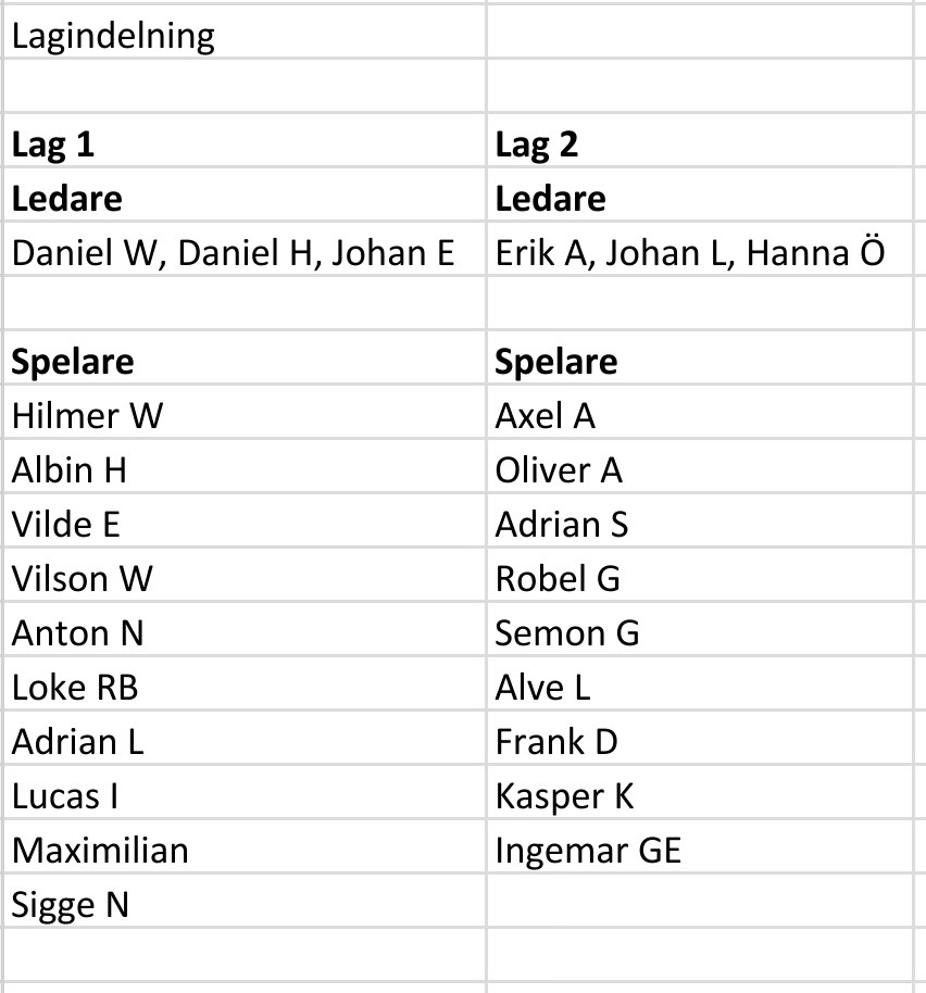 Hej! Hoppas att alla grabbar är taggade inför söndagens cup i Öjebyn. Bussen avgår 07.45 från Boden Arena Så var på plats 10 min innan, beräknad hemfärd från Öjebyn är ca. 1600. Lagindelning finns i bifogad bild, kom ihåg att skicka med, skor, sockar, svarta shorts, överdragsdress och vattenflaska. Sen finns det klämmackor, varmkorv och fika till försäljning. Matchtider: Lag 1 1100, plan 2 1430, plan 2 1530, plan 2 Lag 2 1200, plan 2 1300, plan 1 1500, plan 2 Väl mött pigga, utvilade och laddade för en kanondag i hallen 😃 /Tränarna