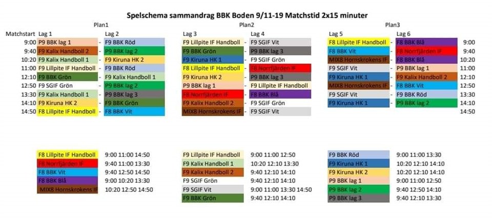 Nu är det snart dags för matcher. Vi kommer dela in laget i tre grupper, vilka grabbar som spelar i vilket lag meddelar vi på plats på lördag. Gemensam samling för alla lag kl 8:15 för peppning och utdelning av matchkläder i Björknäshallen. Vi spelar 3 matcher per lag och matchtiden är 2x15 min se bild. Det är tätt mellan matcherna så se till att grabbarna ätit en ordentlig frukost och druckit innan första match. Hoppas att vi får en stor publik på vårt första sammandrag. Är det några frågor kontakta oss tränare direkt. Daniel W, Daniel H, Johan E, Hanna Ö