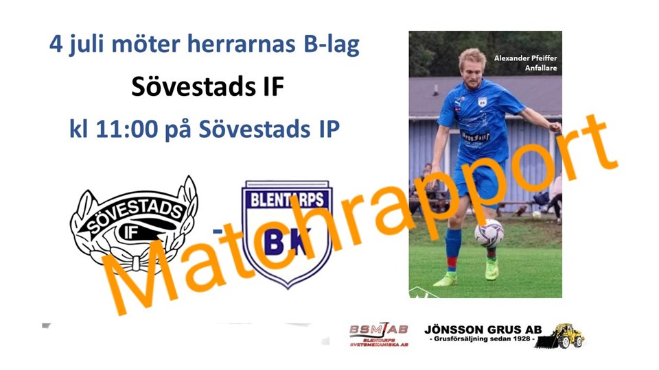 Matchrapport B-laget, Sövestads IF - BBK 4-10 B-laget mot Sövestads IF. Då fick vi äntligen en match i B-laget och där passade vi på att börja slussa in killar från Jonas Anderssons P05/06-lag. Casper Ernebrant i mål, Hugo Holmgren på högerback, Oscar Linde på vänster mittfält och Mario Andersson på mitten. Alla 4 gör det med beröm godkänt och lite extra kul för Mario som fick spela centralt med sin far Jonas Andersson. Vi hade några A-lagspelare med också. Våra mål gjordes av Liam Månsson 2 , Jonathan Overgaard 2, Simon Karlsson 2 , Albin Jönsson 1 , Jonas Andersson 1, Oscar Linde 1 och Adam Kristensson 1 . Mats Jeppsson, huvudtränare