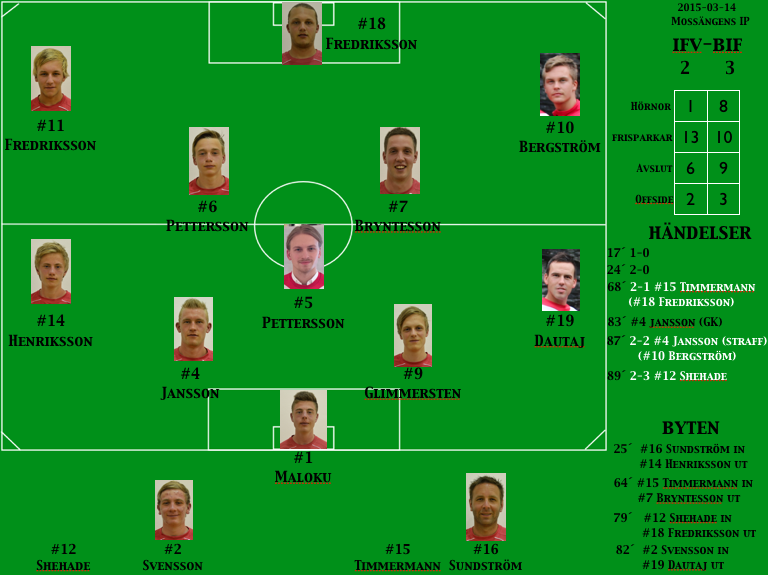 BIF tog i lördags sin andra seger. En match där vi inte riktigt är nöjda med våran prestation men att se våra gubbar visa bra moral och vända ett 2-0 underläge till seger trots att spelet inte stämde helt för oss denna dag. Vi försöker att rulla bollen på vårat sätt en passningsorienterad fotboll. En ung Erik Timmermann kom in i andra halvleken och var en frisk fläkt med mycket kreativitet. Han gjorde också 2-1 målet. Sedan kunde Robin Jansson på straff rulla in bollen till 2-2 efter att Rasmus Bergström blivit nedgjord i straffområdet. I den 89:minuten högg Mahmoud "Mido" Shehade på en tveksam hemåt passning som målvakten sköt rakt på mido som efter lite flipper spel fick kontroll på bollen och stötte in den i mål till 2-3. Tisdag 17 Mars 19:00 Fotboll (Långevi) Torsdag 19 Mars 19:00 Fotboll (Långevi) Lördag 21 Mars 10:30 Fotboll (Långevi)