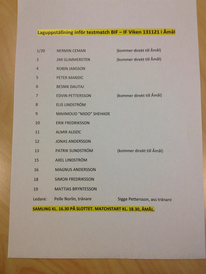 Mål: 0-1 Almir Aldzic (Robin Jansson) Torsdagens match var ett tillfälle att testa ett par nya ansikten. Vi hade två nya ansikten som var med och visade upp sig. Jonas Andersson (Bäckefors IF), Almir Aldzic (Eds FF) båda två anfallare och bildade ett starkt anfallspar. Vi har bra koll på matchen med ett starkt försvarsspel. Viken rinner igenom ett par gånger men där står Nermin Ceman ivägen och gör en mycket stabil insats! Jonas och Almir gör ett bra jobb i sina positioner. Mycket bra på att suga in bollen och fördela den vidare. 0-1 kommer på en fast situation som vi får 15-20 meter utanför vikens straffområde. Peter Mandic uppfattar situationen snabbt och tar tag i i bollen levererar en perfekt crossboll till Robin Jansson som tagit löpning mot bortre delen av straffområdet som nickar bollen in mot straffpunkten där Almir kommerr störtande och stöter in bollen i mål. Snyggt 0-1 mål av BIF. Bra jobb av samtliga i dagens match då vi har vart lediga i över en månad. Edvin Pettersson gjorde senior debut i slutet av matchen och gjorde det stabilt. Laget: Mål: Nermin Ceman Back: Elis Lindström, Patrik Sundström, Peter Mandic, Jim Glimmersten Mittfält: Besnik Dautaj, Magnus Andersson, Robin Jansson, Erik Fredriksson Anfall: Almir Aldzic, Jonas Andersson Avbytare: Simon Fredriksson, Axel Lindström, Mahmoud Shehade, Edvin Pettersson, Mattias Bryntesson
