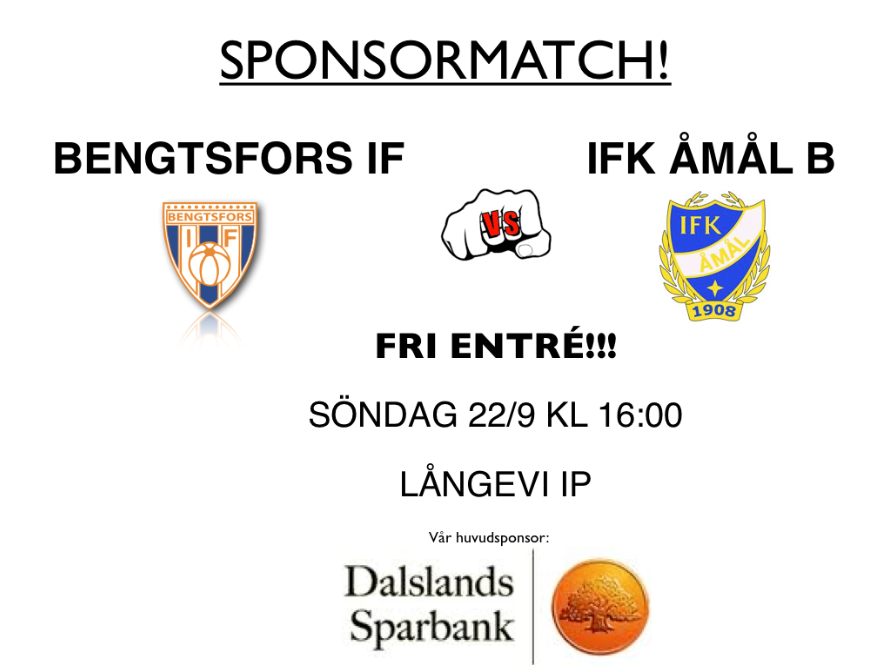 Söndagen den 22 september kl.16,00 möter Bengtsfors IF gästande IFK Åmål i sista hemmamatchen för säsongen. Detta är också en sponsormatch vilket betyder att publiken har fritt intäde till detta evenemang. Runt själva matchen finns också andra aktiviteter och vi hoppas ju på mycket folk denna eftermiddag på Långevi. Sponsormatch innebär som det låter att våra fantastiska sponsorer står för entrén denna dag. I Dalslänningen kommer en stor annons under V38 vad avser denna match och här kommer alla sponsorer att synas. Vi säger dock även här: ETT STORT TACK till Er sponsorer!