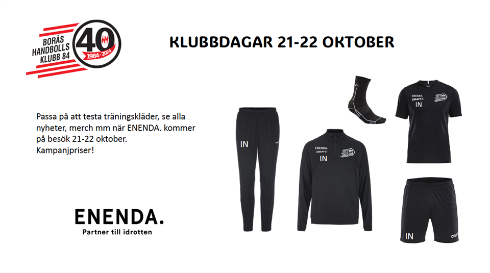 Vår partner Enenda till oss för att vi ska kunna prova och beställa träningskläder för handbollen. De finns på plats i Lundbyhallen 21 & 22 oktober mellan 16:00-18:00 Med sig har de kläder i alla storlekar att prova och hjälper gärna till att beställa på plats. Välkomna!