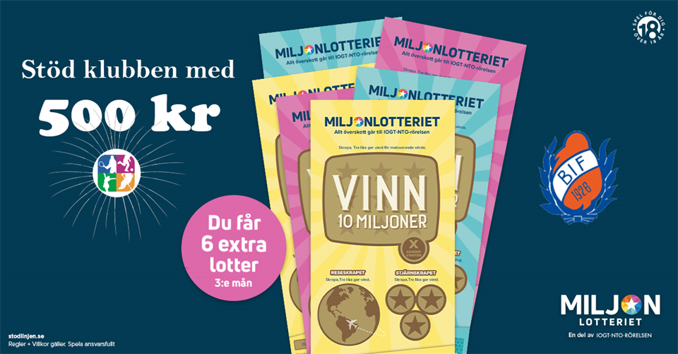 Ta chansen och kamma hem storvinsten och stötta samtidigt Broby IF med viktiga intäkter! Genom att köpa 6 lotter hos Miljonlotteriet (utan bindningstid) för 150 kr får vi hela 500 kronor. Erbjudandet gäller enbart dig som är ny kund och Du måste ha fyllt 18 år. Om vi alla testar på detta fantastiska erbjudande så är det otroligt viktiga intäkter som kommer in med liten insats. Vi har dessutom chansen att vinna pengar: Köp dina lotter här och tipsa gärna minst 2 personer till i din närhet:Miljonlotteriet BROBY IF Broby IF tackar ödmjukast för din insats!