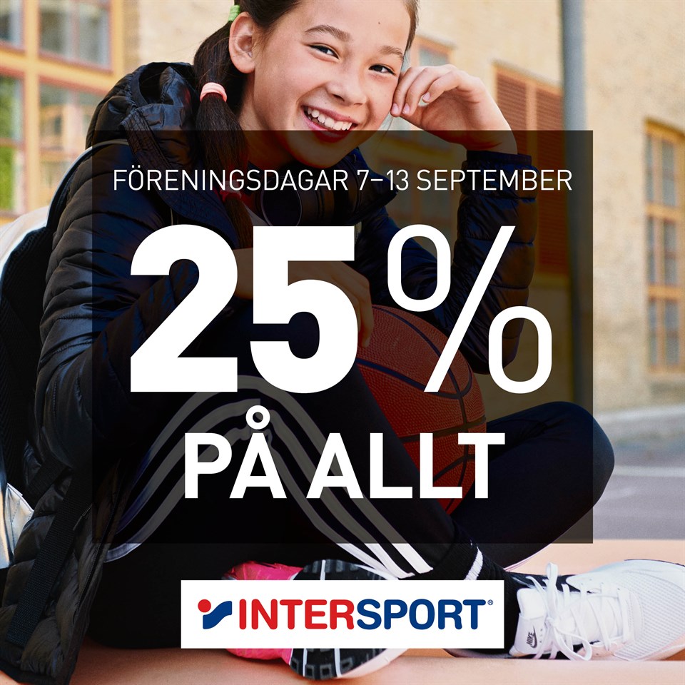 Den 7–13 september önskar vi alla medlemmar välkomna på exklusiva föreningsdagar hos vår samarbetspartner INTERSPORT! Som medlem får du 25% rabatt på allt i butiken*. Passa på att inhandla det senaste sportmodet och allt för en ny härlig idrottssäsong. Ta med den här inbjudan (bifogat) till någon av våra butiker eller visa upp den i din smartphone i kassan för att erhålla rabatten. Du kan också använda rabattkoden FÖRENING25 på intersport.se. Välkommen till din närmsta Intersportbutik eller intersport.se! *Erbjudandet gäller 7–13 september på ord.pris, dock ej på presentkort, hockey, bandy, elektronik, cyklar, träningsmaskiner, studsmattor, Hövding, Thule, golf, föreningskläder/teamkläder eller beställningsvaror.