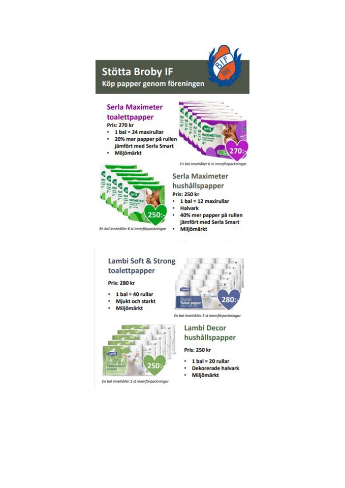 Hej Föreningen tog hem lite extra toalettpapper och hushållspapper från Lambi och Serla som vi nu vill ha hjälp med att få sålda. Extrapris: 250kr balen. Ingen skillnad på sort eller märke. Kontakta Niclas 0733-825463 om ni vill köpa Toalettpapper: Serla bal(24st maxi rullar) Lambi bal (40st rullar) Hushållspapper: Serla bal(12st maxi rullar) Lambi bal(20st rullar) Tack för ert stöd. F2011/2012 18 jan 2024 0kommentarer