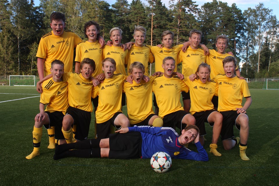 Näst sista seriematchen för säsongen är nu spelad och seriesegern är klar! Grattis grabbar! Inför den näst sista matchen har vi 6p mer än Tierp som ligger hack i häl och har spelat riktigt bra under hösten (7-1 vinst mot Bälinge i returmötet). Vi behövde minst 1p för att seriesegern skulle vara helt säker. Dagens match spelade vi på konstgräset i Bälinge mot IK Fyris, domare är Mikael Levin. Vi har alla killar friska och spelbara idag. Under första halvlek skapas en hel del chanser åt bägge håll, stundtals är det riktigt bra spel i bägge lagen. Som så många gånger tidigare under säsongen är ställningen 0-0 i halvtidspausen. Vi pratar om att vara mer positiva på planen, peppa och stötta varandra, ligga närmare motståndarna och komma till fler avslut. Vi flyttar upp några positioner och spelar med fler anfallare. En bit in andra kommer Fyris ledningsmål, en situatution där vi blir stillastående i egen försvarszon och Fyris kommer till ett fint avslut på distans. Vi fortsätter att nöta på och skapar många chanser till kvittering. Med ca 15 min kvar tar Fyris timeout. Vi fortsätter att spela på och i en snabb omställning med spel ut på högerkanten till Tim och en bra passning till Filip så är 1-1 ett faktum. Bägge lagen gör en mycket bra kämpainsats idag och med lite trötta ben på slutet så kommer även några mindre bra timade brytningar, några varningar och en utvisning som resultat. Dagens domare gav beröm till bägge lagen att det var en mycket bra match och roligt att döma. Tack till IK Fyris för dagens spännande och roliga match. Hoppas vi ses fler gånger framöver. //Ledarna