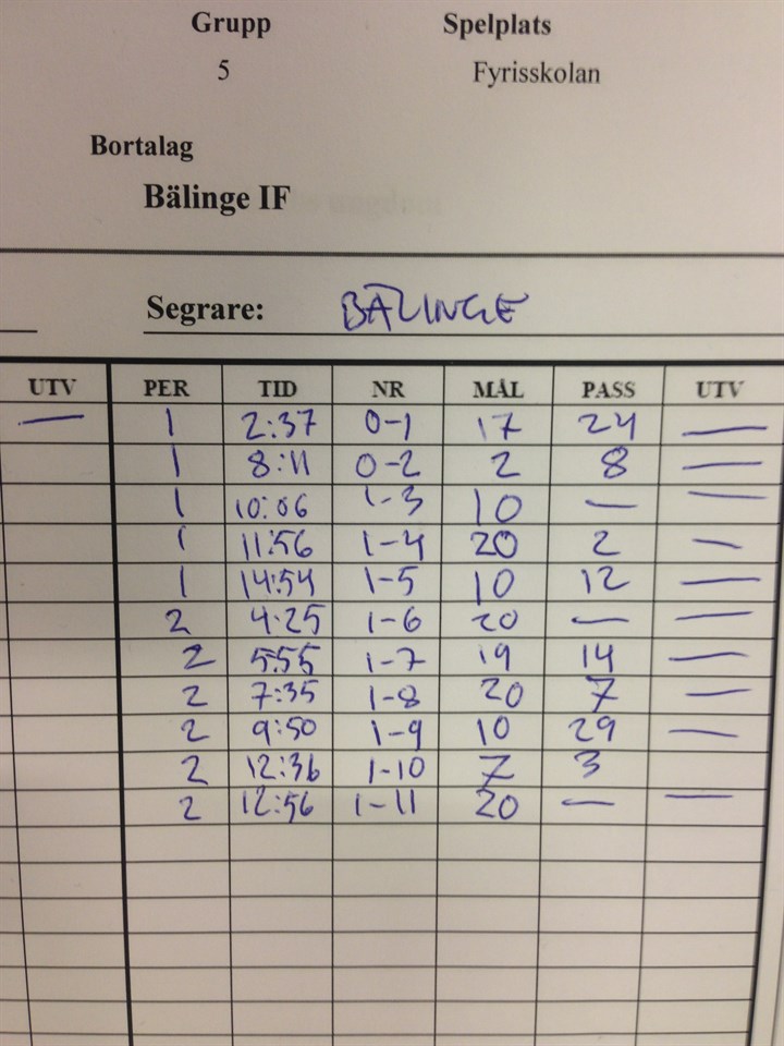 Föräldrarna inklusive syskon ställde upp med 15 spelare (10 föräldrar och 5 syskon), Olle, Jacob och Örjan turades om i målet, och alla gjorde en mycket bra insats!! Grabbarna var 10 spelare med Ludde i mål. Matchen spelades över 3 perioder á 15 minuter. Föräldralaget tog snabbt ledningen med 2-0, grabbarna vaknade till och ledde efter första perioden med 4-2. Vid ledning 11-7 för grabbarna och med mindre än 5 minuter kvar trodde nog de flesta att saken var klar. Ungdomskedjan med Axel och Ludde på top gjorde några snabba mål på slutet och Noel hade i princip öppet mål med några sekunder kvar, matchen slutade med vinst för grabbarna 11-10. Stort tack till alla för en bra insats, chans till revansch kan vi nog ordna till innan säsongen är slut. I målprotokollet noteras: föräldrarna: Axel, Ludde, Robin, Hampus, Krippe och Örjan (självmål) grabbarna: Noel, Gustav, Leo, Melvin, Hannes, Adam Tack till föräldralaget; Krippe, Thomas, Sofie, Axel, Örjan, Robin, Andreas, Noel, Hampus, Ludde, Jacob, Eva, Olle, Erin och Monica Tack till grabbarna: Ludde, Tim, Måns, Martin, Adam, Noel, Leo, Melvin, Gustav, Hannes och coach Ekan