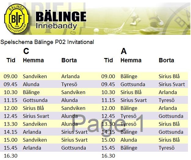 Speltid 2x15 min (effektiv sista minuten av andra), ingen time-out, inget slutspel, 5 matcher per lag Spelplats: A och C plan i Allianshallen, Rapsgatan 8 Uppsala. Hallen kommer att vara öppen från 8.15, alla lag kommer att ha tillgång till ett eget omklädningsrum under hela dagen. Nyckel kvitteras ut vid disken brevid entreen till Klubbhuset, omklädningsrummen finns en trappa ner. Mellan 10.30 och 13.30 kommer det att finnas hamburgare att köpa brevid ingången till Allianshallen. Under hela dagen kommer kiosken att vara öppen.