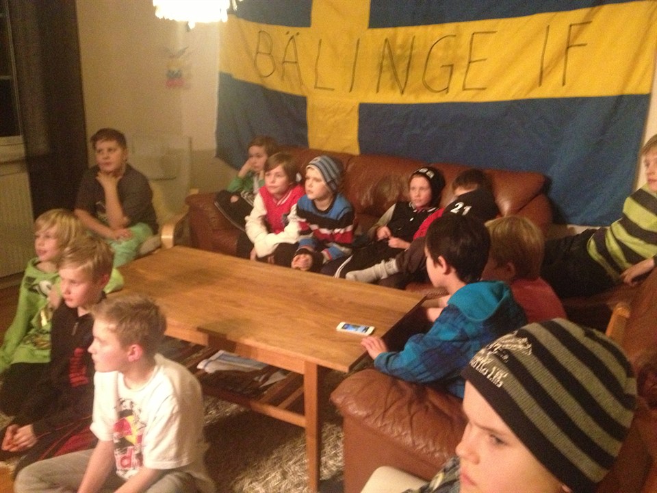 Här sitter laget för att stötta Måns och Tim som tävlade i Lilla sportspegeln.