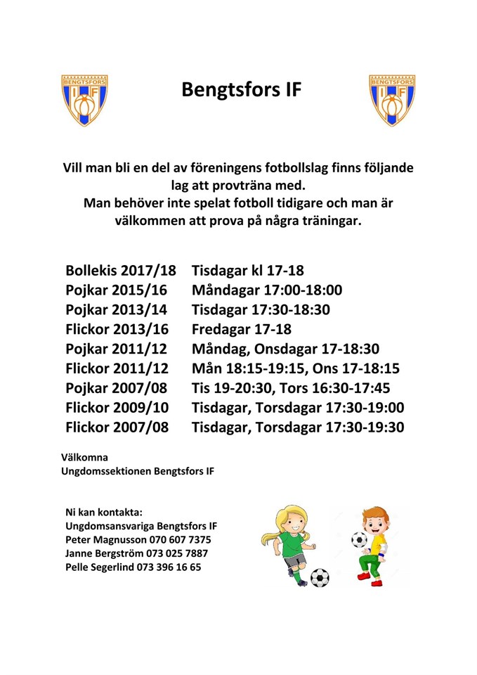 Aktiva lag i Bengtsfors IF 2024 Lagen är året dom är födda. Bollekis födda 2019, uppstart April/maj 2024 Bollekis födda 2017/18 - Ledare, Juliane Thiele: 073-842 2491 Pojkar 15/16 - Ledare, Shkelqim Dautaj: 073-142 2878 Pojkar 13/14 - Ledare, Peter Johansson: 070-284 5285 Pojkar 11/12 - Ledare, Martin Augustsson: 070-325 6378 Flickor 13/16- Ledare, Kitty Niskanen: 073-203 1204 Flickor 11/12- Ledare, Jessica Karlsson: 073-679 7351 Flickor 09/10- Ledare, Peter Magnusson: 070-607 7375 Kom gärna och prova på att vara med, se på lagens egna sidor vilka tider träningarna är. Bengtsfors IF har fått jämställdhetspris för satsningen att ha rena flicklag och att föreningen har jämn fördelning av aktiva killar och tjejer. 2023 var föreningens fokus att satsa på ungdomarna, nytt år men målet och fokuset kvarstår, föreningens fokus 2024, att få igång barnen och ungdomarna att börja vara mer aktiva och ha kul med att spela fotboll. Alla är välkomna att var med, tag gärna kontakt med någon i ungdomsektionen om man har frågor "Peter M- 070 6077375". //Peter Magnusson -USEK