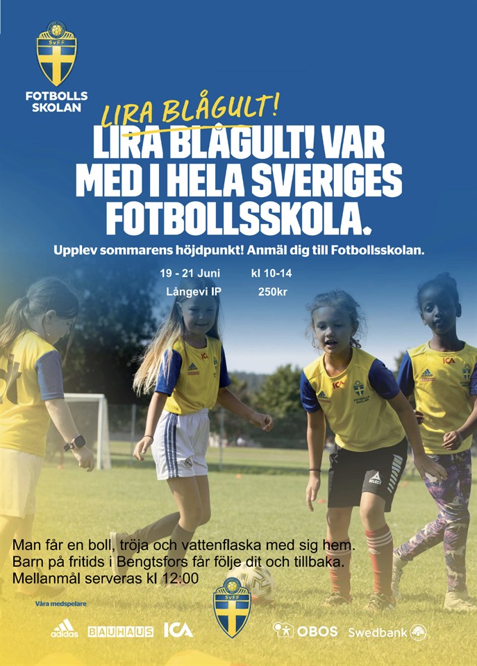 glöm inte årets fotbollsskola. I år har vi ålder 5-12 år 19-21 Juni kl 10-14 https://start.landslagetsfotbollsskola.se/sv/clubs/8494-bengtsfors-if/webanmalan/new Sista anmälningsdag är 29maj. Man får med en vattenflaska, boll och tröja Mellanmål: smörgås, yoghurt, frukt. Långevi och franserud förskola följer barnen till långevi