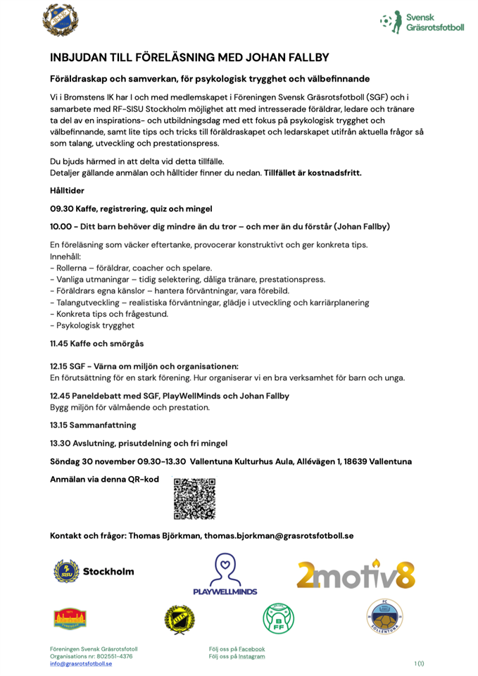 Svensk Gräsrotsfotboll har samordnat så att det arrangeras en föreläsning med Johan Fallby.