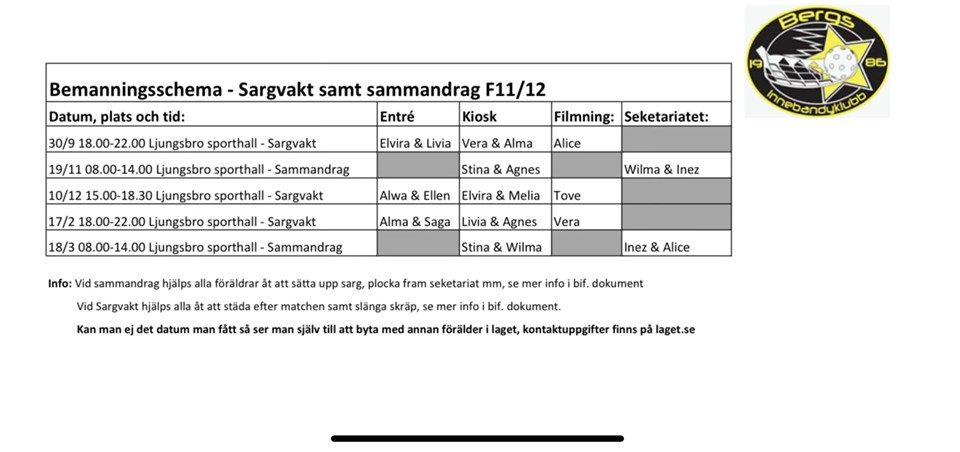 Nu på tisdag den 5/4 är det sista träningen för denna säsong och vi avslutar med föräldramatch mot alla mammor :) Är det någon mamma som ej kan vara med så är kravet att papporna har peruk & bh med innebandybollar i :) Matchstart 17.30 Alla barn har på sig sina matchställ som lämnas in efter träningen så ta med ngn form av ombyte! Nu laddar vi inför tisdag! mvh/Ledarna F 10/12 31 mar 2022 0kommentarer