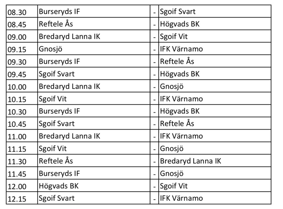 Vi har vår första match kl 09:00, så jag tänker att vi samlas kl 08:00 vid klubbstugan för gemensam avfärd mot Burseryd. Byter om och duschar gör vi i Burseryd. Prisutdelningen är 12:30, vår sista match är slut kl 11:42 så tänker att då hinner vi duscha.