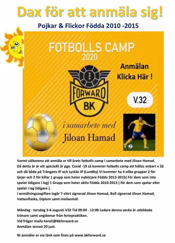 Varmt välkomna att anmäla er till årets fotbolls camp i samarbete med Jiloan Hamad. Då detta år är ett speciellt år pga Covid -19 så kommer fotbolls camp att hållas enbart V 32 och då både på Trängens Ip och Lyckås IP ( Lundby ) Vi kommer ha 4 olika grupper 2 för tjejer och 2 för killar 1 grupp som heter nybörjare Födda 2013-2015( För dom som inte spelat tidigare i lag ) 1 Grupp som heter aktiv Födda 2010-2013 ) för dom som spelar eller spelat i lag tidigare ). I anmälningsavgiften 600:- ingår T-shirt signerad Jiloan Hamad , Boll signerad Jiloan Hamad,Vattenflaska , Diplom samt mellanmål . Föreningen fakturerar er efter anmälan ! Måndag - Torsdag 3-6 Augusti V32 Tid 09:00 - 12:00 Ledare denna vecka är utbildade tränare samt ungdomar från feriepraktiken. Vid frågor maila kansli@bkforward.se Anmälan senast 20 juni . Vi kommer naturligtvis följa Folkhälsomyndighetens rekommendationer och riktlinjer gällande Covid -19! Vi har så pass stora ytor och planer på Trängen så vi ser i dagsläget ingen risk att inte kunna genomföra detta arrangemang på ett tryggt och säkert sätt. Vid ev beslut som gör detta omöjligt kommer vi återbetala anmälningsavgiften ! Anmälan hittar ni i högerspalten på hemsidan ! F 2012/2013 31 maj 2020 0kommentarer