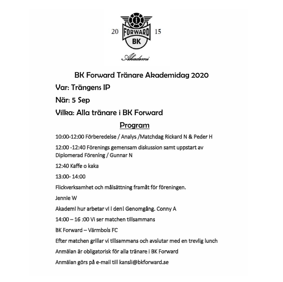 Tränare ! Glöm inte anmäla er till Akademitränar dagen nu på lördag den 5è Obligatoriskt för alla tränare i BK Forward . Anmäl er med namn senast nu på Torsdag ! Mvh Gunnar Nilsson Ordf.BK Forward F 2012/2013 31 aug 2020 0kommentarer
