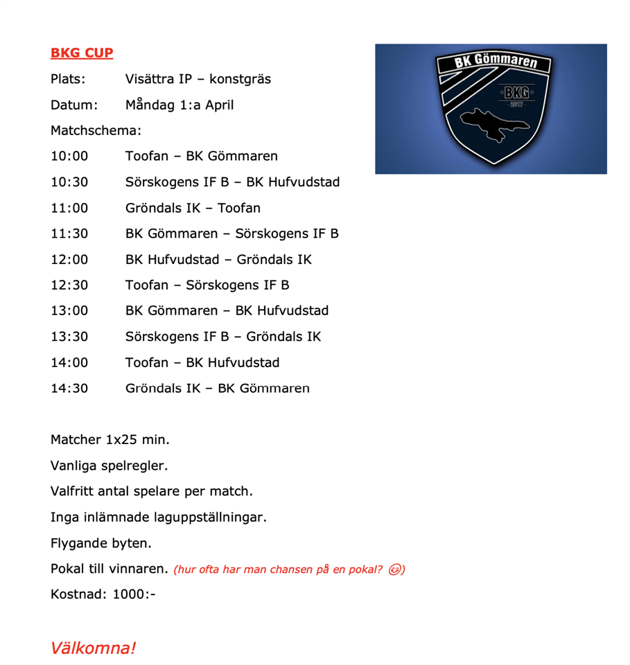 Hej alla. Vi ställer in morgondagens träning då en del är på påskledighet och andra behöver vila sig i form inför måndagens cupspel. Kallade: Gustav, Timur, Cronis, Fischer, Sam, Östlund, Byman, Carl, Stach, Åberg, Alfred, Mackan, Berghult, Lager, Johan J, Nikolic, Jashan, Daniel, Henke, William, Jimmy, Karlquist Vi kommer ta ut ett lag till varje match så ta med varma kläder för dom matcher som ni inte spelar. Samlig kl. 09:15 Matcherna är 1 x 25 minuter och vi är garanterade 4 matcher. Se bifogad fil med spelschema.