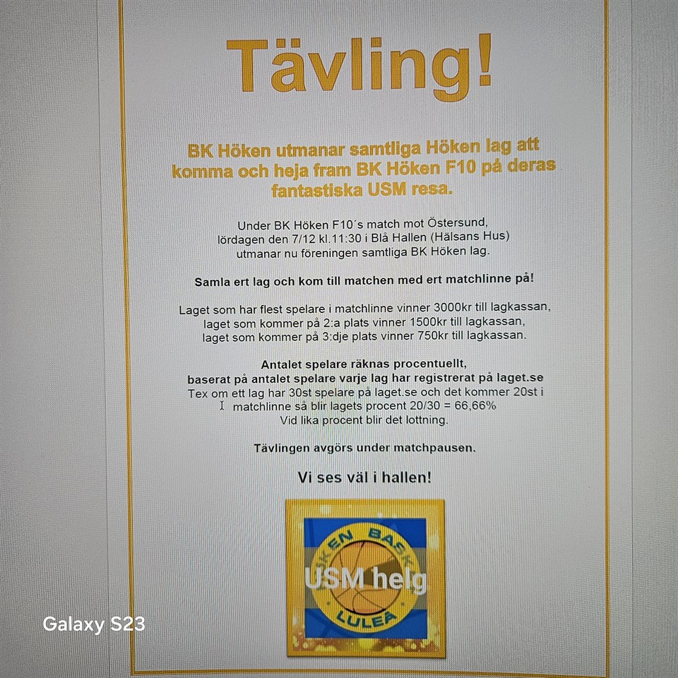 Under BK Höken F10´s match mot Östersund, lördagen den 7/12 kl.11:30 i Blå Hallen (Hälsans Hus) utmanar nu föreningen samtliga BK Höken lag. Samla ert lag och kom till matchen med ert matchlinne på! Laget som har flest spelare i matchlinne vinner 3000kr till lagkassan, laget som kommer på 2:a plats vinner 1500kr till lagkassan, laget som kommer på 3:dje plats vinner 750kr till lagkassan. F-12 5 dec 2024 0kommentarer