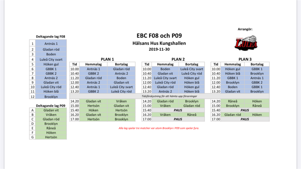 Hej, här kommer lagindelningen till lördagens drabbning. Höken gul: Alice T, Arven, Abia, Jordan, Julia G, Lisa 10.10, 11.30 och 14.30 (samling kl 9.30) Höken blå: Alice W, Majken, Emma, Tuva, Tilya, Hulda. (Samling kl 11) 11.30, 13.50 och 15.50 Min bil: Alice T, Abia, Jordan och Arven Annikas bil: Alice W, Majken och Tilya En bil: Julia G och Lisa (ska vidare till Dundret efter matcherna) En bil (Huldas pappa eller Tuvas mamma?): Tuva, Emma och Hulda Byt med varandra och ändra hur ni vill, bara kidzen tar sig dit😊 Notera att vi inte har träning denna fredag, 13/12. Skriv en kommentar om ni önskar förbeställa tacolunch. Måste meddela Jokkmokk senast kl 12 på torsdag. Vuxen 75 kr, barn 50 kr Spelschema
