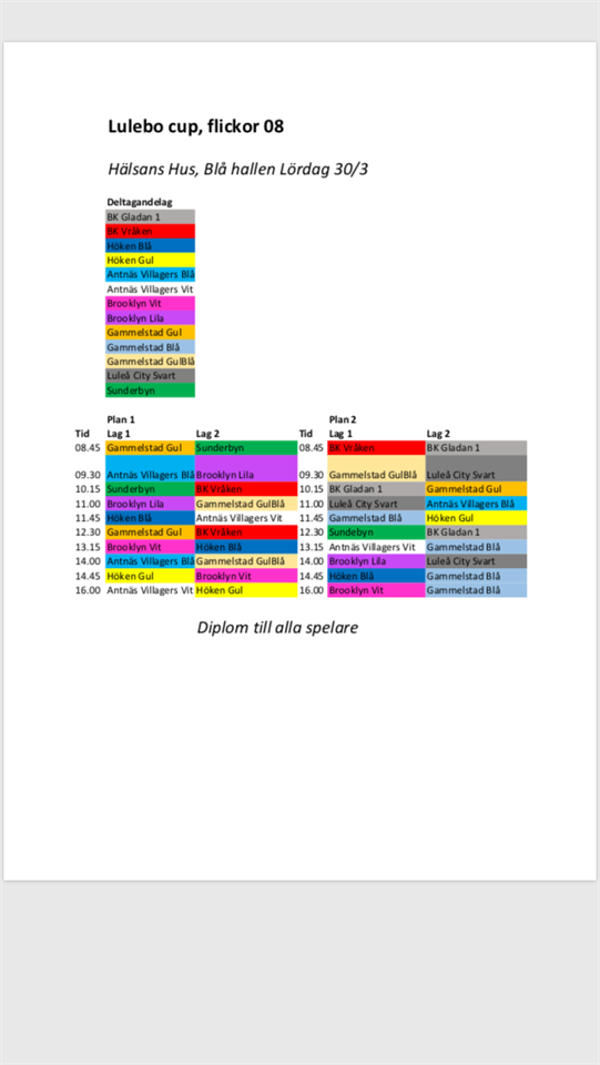 Vi spelar i hälsans hus, blå hallen på lördag. Samling 11.15 för båda lagen. Lagindelning Höken blå (Mariana coachar): Arven, Abia, Jordan, Molly, Emmy, Ena, Alice W, Ruth. Höken gul (Anne coachar): Alice T, Hulda, Julia Z, Tuva, Nova, Majken, Emma. P.S. Vi kör de tre sista träningar efter cupen, 1/4, 4/4 och 11/4. Därefter någon slags avslutning.