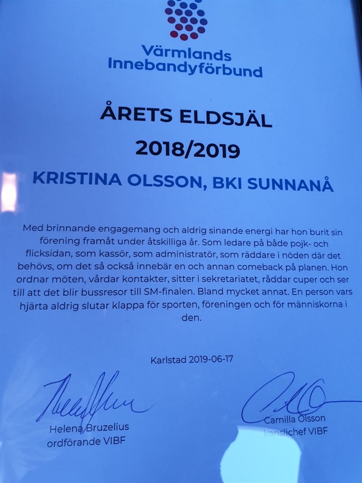Kristina Olsson blir årets eldsjäl inom Värmländsk innebandy. En utmärkelse som Cina gjort sig riktigt förtjänad av efter många år av helhjärtat arbete för BKI Sunnanå. BKI Sunnanå 19 jun 2019 1kommentar