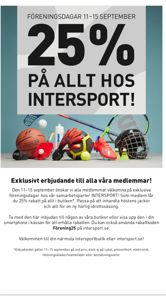 Intersport bjuder in till föreningsdagar. Fin rabatt på hela sortimentet :) Visa upp detta i kassan. Och på Intersport.se använder man koden: Förening25 /Styrelsen BKI Sunnanå 13 aug 2019 0kommentarer