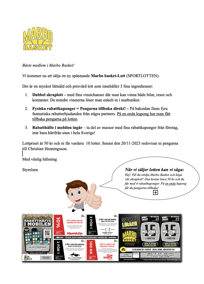 Hej Alla, Hoppas att ni har det bra och att säsongen börjat på ett fint sätt för alla. Det är härligt att komma ut i hallarna och se full aktivitet. Med syftet att förstärka klubbens kassa så beslutade styrelsen att testa ett nytt lotteri. För samtliga lag att sälja. Lotten skall egentligen ses som ett värdehäfte där man vid köp av en lott på 50kr även tillgodo gör sig fantastiska erbjudanden. Läs i separat följebrev. Jag vill att varje lag utser en lotteriansvarig, lämpligen en förälder som hämtar lotter och fördelar ut i laget. Jag kommer att finnas i Kinnahallen på onsdag kväll 18.00-18.30 för att lämna ifrån mig lotter. Det går även att boka egen tid för att hämta lotter på telefon 0724454349 Med vänlig hälsning MARBO BASKET Christian Henningsson Basketklubben Marbo 16 okt 2023 1kommentar