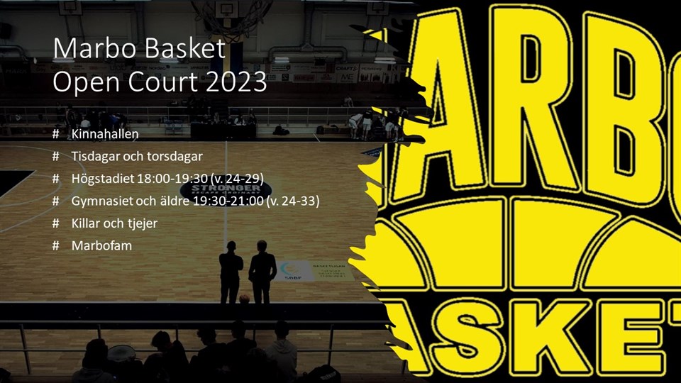 Under sommaren är det på tisdagar och torsdagar vissa veckor Marbo Open Court i Kinnahallen. På Marbo Open Court kan du öva skott, utföra egna teknik- och fysövningar, lira matcher och hänga med kompisar. För killar och tjejer på högstadiet (födda 2008-2010) är det kl 18:00-19:30 som gäller och för gymnasiet och äldre (2007-) 19:30-21:00. För högstadiet gäller veckorna 24-29 (hittills) medan för gymnasiet gäller veckorna 24-33. UPPDATERING: OPEN COURT Högstadiet kör även vecka 30-32. Denna sida uppdateras om det blir fler veckor för högstadiet. Go Marbo Basketklubben Marbo 2 jun 2023 0kommentarer