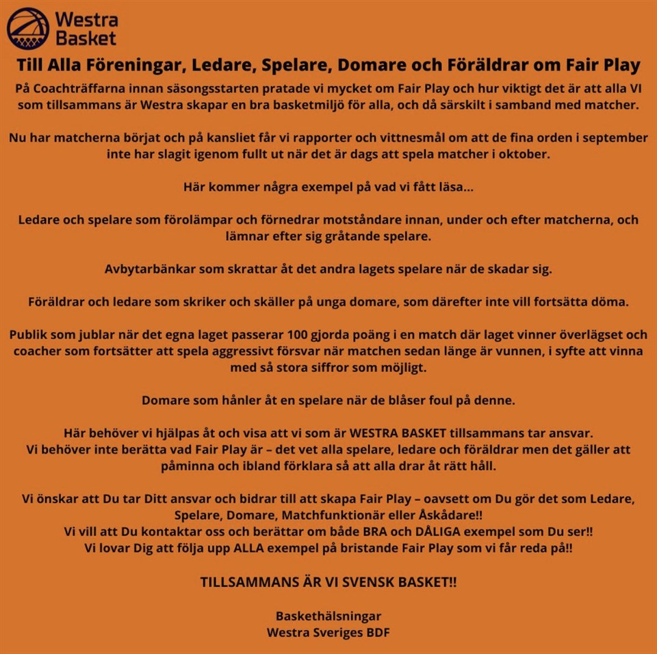 Den här bilden har Westra basket lagt ut på sociala medier. Läs gärna texten och tänk på att vara en god förebild. Detta gäller alla som representerar Marbo basket på något sätt i en baskethall: spelare, coacher, föräldrar, domare. Marbo basket står bakom FAIR PLAY! #marbofam💛 Basketklubben Marbo 3 nov 2022