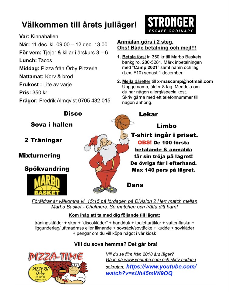 Här kommer inbjudan till årets julläger. Sista anmälningsdag är 1 december och anmälan görs i flera steg (se inbjudan). Anmäl till x- mascamp@hotmail.com. Basketklubben Marbo 24 okt 2021 0kommentarer