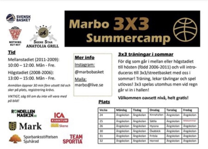 Efter dryga året med Corona och dess inverkan på basket, skola, arbete mm hoppas vi på en vanlig basketsäsong 2021-2022. Marbo vill tacka alla som efter omständigheterna gjort så mycket för klubben och våra ungdomar under pandemin. 👍👍 Under sommaren har vi sommarträning 2 dagar per vecka i Kinnahallen. Tisdagar och torsdagar. Spelare födda 2006-2008 Kl 17:30 - 19:00 Spelare födda 2005 och tidigare Kl 19:15 - 20:45 3X3 Summercamp enligt bilaga. Den är mestadels vid Ängsskolan i Skene. Återigen, ha en riktigt fin sommar🏀 Marbo styrelse Kaj Brännmark