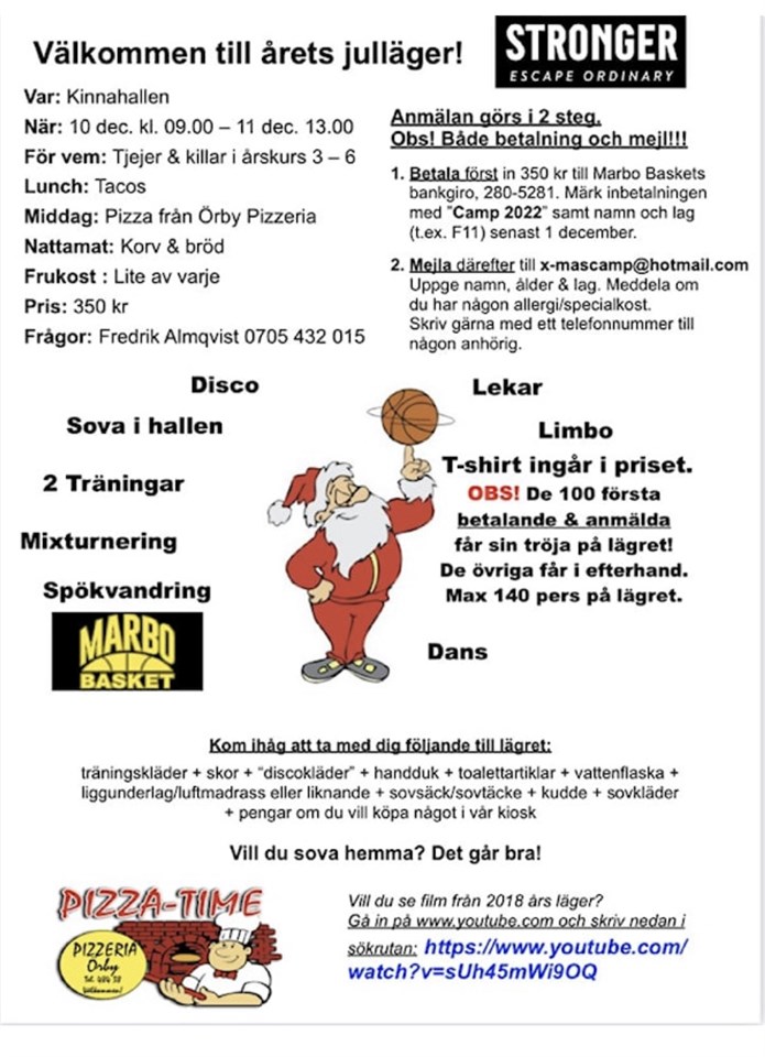 Här kommer inbjudan till årets JULLÄGER! Det gäller för barn från årskurs 3-6. Vi träffas i Kinnahallen klockan 9.00 lördagen den 10 december och lägret avslutas söndagen den 11 december klockan 13.00. Det blir massor av basket, lekar, disco, spökvandring mm. Vill du sova hemma? Det går också bra! De 100 första anmälda är garanterade årets jullägertröja. Glöm inte att anmäla dig i tid! Sista dag för anmälan är 1 december. Vi tar max emot 140 anmälningar. Se mer information på den medföljande inbjudan. Vi ses! F-10 6 nov 2022 2kommentarer